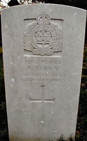Lance Corporal 320064, 15th Battalion, Suffolk Regiment. Died of wounds 3 September 1918. Aged 28. Buried in DERNANCOURT COMMUNAL CEMETERY EXTENSION Somme, France. Son of Thomas and S. Brown, of Morleys Cottage, Exning, Newmarket, Suffolk. Born Swaffham, Cambridgeshire, enlisted Newmarket. Formerly 12222, Suffolk Regiment. |