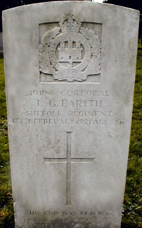Private 24880, 11th Battalion, Suffolk Regiment. Killed in action 3 April 1917, buried ST. NICOLAS BRITISH CEMETERY, Pas de Calais, France. Born Little Wilbraham, enlisted Newmarket. |
