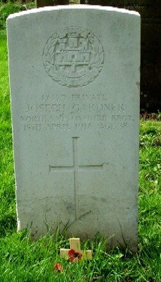 [Spelt GRIFFEN on CWGC] Private 23738, 7th Battalion, Bedfordshire Regiment. Died 18/6/1916 in France & Flanders. Age 26. Born Alwalton, enlisted Bedford, resident Alconbury. From the 7th Beds War Diary, "No 23738 Pte Griffin J, C Coy, shot himself, died in Field Ambulance." Son of Mrs. Rose Griffen, of 22, Green Lane Rd., Leicester. Buried in St. Pierre Cemetery, Amiens, Somme, France. Grave I. D. 4. |