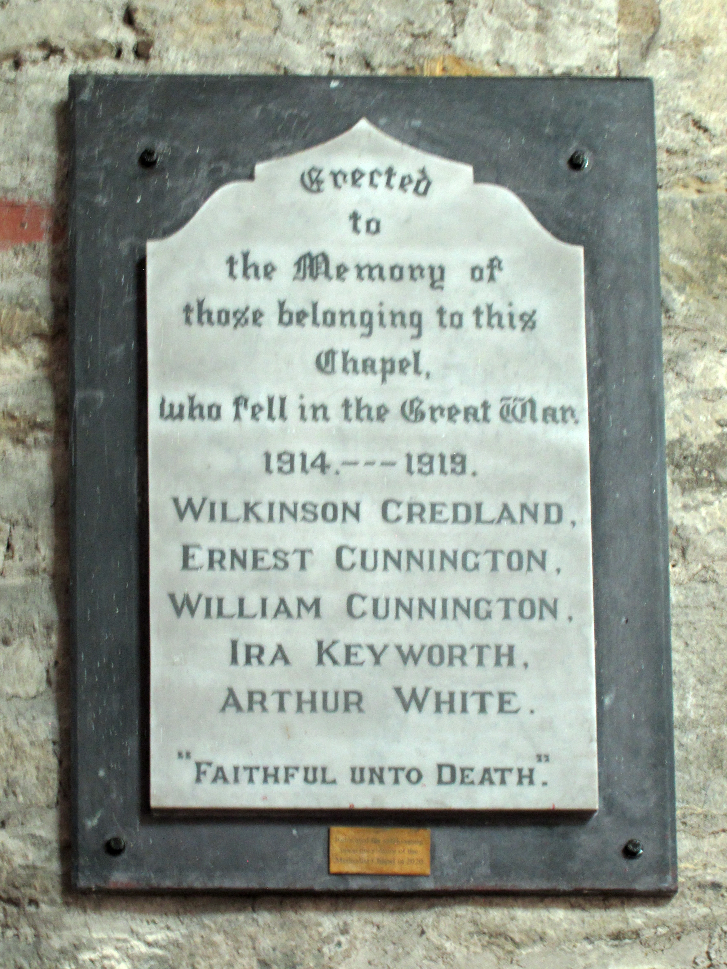On the North wall of the nave is a tablet originally from the Methodist Chapel, with 5 names from World War 1, only one (Ira Keyworth) not being on above World War 1 memorial.