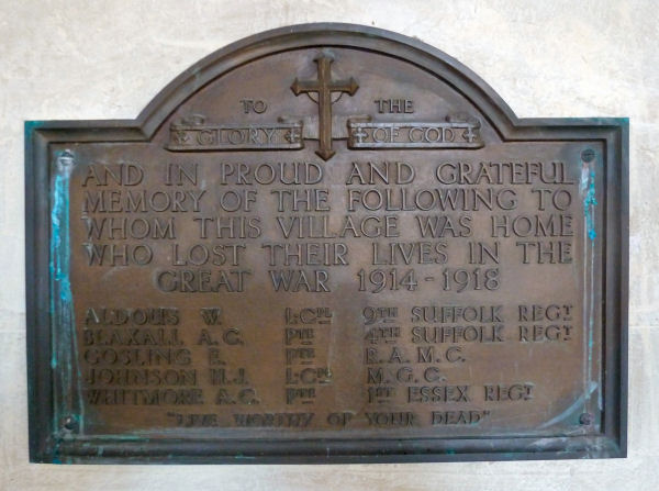 Service No 3684. Born in Eye in 1896 to Samuel Blaxall and Frances Chapman. The family had moved to Tannington by 1901. A private in the 4th Batt. Suffolk Regiment, he died on August 30th 1916 and is commemorated on the THIEPVAL MEMORIAL |