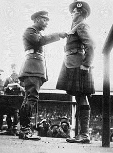 standing bareheaded Gordon Highlander behind him, bearing a colour;
