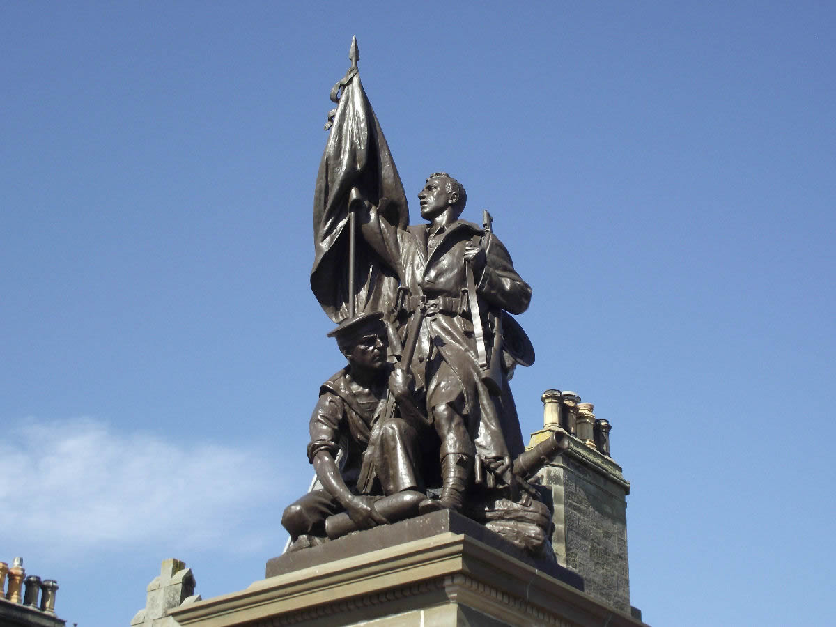 form of a centotaph topped by statues of a soldier and sailor carrying
