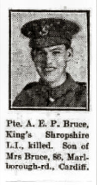 Extract from De Ruvigny's Roll of Honour - Volume 3 - Page 39: BRUCE, ALBERT EDWARD PERCY, Private, No. 15944, 5th (Service) Battn. The King's (Shropshire Light Infantry), 2nd s. of Thomas Bruce, of 86, MarIborough Road, Cardiff, Master Mariner, by his wife, Marguerite Jane, dau. of James Partridge : b. Liverpool. 25 Feb. 1895; educ. Albany Road Council School, and St. Mary’s Hall, Cardiiff : was an Apprentice at sea; enlisted in Nov. 1914; served with the Expeditionary Force in France and Flanders; was wounded in May, 1915, and invalided home; rejoined his regiment the following Aug., and was killed in action at Delville Wood 31 Aug. 1916. Buried north-east of Delville Wood. His Sergeant wrote : "He was a Machine Gunner belonging to the section of my platoon and I can assure you I have lost one of my best men. His section received the thanks of the Brigadier-General for the splendid work they did in breaking up the German attack. He has left a good name behind him, and he will never be forgotten by his pals. He would have had promotion a long time ago, but he preferred to stop as he was.” Unm. |