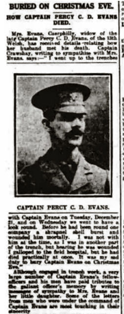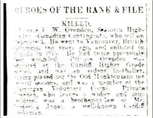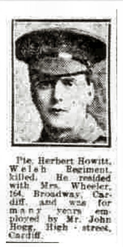 Note: Although the cutting shows his details the connection with Roath or Cardiff does not appear anywhere in his details and this is highly suspicious. In the 1891 census he is resident at Butts Lane, Longworth, Faringdon, Berkshire, born Berkshire. In 1901, resident in Butts Lane, Longworth, Faringdon, Berkshire, born Wotton, Berkshire, Labourer in Nursery. In 1911, lived in Longworth, Faringdon, Berkshire, born Wootton, Berkshire, a Gardener. Husband of Annie (nee Ewens). Married 1909, Andover, Hampshire. Nothing points to Wales or Cardiff or Roath. |