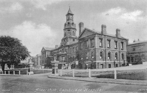 concealed the character of an inflexible and ruthless reformer. When the Camp at Aldershot was first established, it was divided for medical purposes into three areas. By 1856 there were three station hospitals, which together provided accommodation for about 800 patients. The first was a wooden hutted hospital located in V and Z lines near the wooden Garrison Church which later faced the Cambridge and Louise Margaret Hospitals. This first hospital had wards for lunatics and infectious diseases, and accommodation for 33 soldiers' wives and children. A Sister of Mercy acted as matron, and a committee of officers administered a charitable fund to provide extra articles for the patients. The second station was the Union Hospital. This was the only brick building on the heath which became South Camp. Built around 1680 as a private residence, it subsequently became the Union Poor House and school for pauper children. The school was moved to Crondall when the War Department purchased the land. The Union Hospital was behind Salamanca barracks, and there was an extension on the other side of the road behind Talavera Barracks, and each hut had two wards accommodating 16 patients. The wards were described as: "spacious, airy, well-ventilated, lighted with gas and fitted with baths, WCs and lavatories complete". Nearby were the office of the Principal Medical Officer and quarters for the Apothecary, Steward and six hospital sergeants. The Union Hospital was closed shortly after the opening of the Cambridge Hospital and the patients were transferred. Those who could do so walked to the new building, whilst the others were taken by horse ambulance. The third station hospital was called the United Hospital, and was located in P and Q lines in North Camp. It was replaced by the Connaught Hospital. The Cambridge Hospital was built by Messrs Martin Wells and Co. of Aldershot at a cost of 45,758, and was opened for the admission of patients on Friday 18th July 1879. The hospital was named after HRH The Duke of Cambridge (1819 - 1904) who was the only son of the seventh son of HM George III. He was made a Field Marshall in 1862, and was Commander-in-Chief of the Army from 1856-1895. The hospital was originally designed as a series of individual "Regimental hospitals" joined by a connecting corridor, with each self-contained to reduce the risk of cross infection. But this system had been discontinued in 1873 before the hospital opened and so it was always run as a single establishment. The architect "proposed that the bricks of the arched roof of the wards shall be perforated, and in connection with flues, through which outlets the heated or ventilated air of the wards shall escape; and the introduction of the external air is provided for by a series of perforated plates of zinc running round the base of the skirting board; and that, moreover, a series of them should likewise run up the centre of the floor for the admission of fresh air into that part of the chamber; and in order to prevent the apertures from in these horizontal plates being obstructed by dust, as well as to guard against fluid during the washing of the ward finding its way into the air passage in connection with the plates, it was suggested that they should be raised, say two inches, above the level of the floor". The interior of the walls were to be faced with brick and whitewashed. The Hospital Board did not approve and "earnestly hoped that this plan may not be adhered to, nothing more unseemly or more cellar-like than would be presented by such an imperfect finish to the wards being approved of; no comforts in the rooms, and no arrangements, could ever compensate for the chilling feature of an uncovered surface of brick wall for the sick man's eye to rest on". The Cambridge was probably the first base hospital in the history of the Army to receive casualties direct from the battle front. The battle of Mons took place on August 20th 1914. The Aldershot News stated that: "The first batches of wounded men arrived at the Cambridge and Connaught Hospitals from Southampton on Sunday. Most of those sent on to Aldershot met with their injuries during the battle of Mons. They were moved to their respective hospitals with the utmost care and solicitude. All tell a terrible story of the desperate character of the fighting at Mons." The Cambridge was also the birthplace of plastic surgery in the British Empire. Captain Gillies (later Sir Harold), on leave in Paris in June 1915, met Morestin who was doing wonderful work on the reconstruction of faces in the Val-de-Grace Hospital in Paris. In his own words Gillies "stood spellbound as Morestin removed half a face distorted with cancer". He fell in love with the work on the spot, and at the end of 1915 was sent back from France to start a Plastic Unit in the Cambridge Hospital. His suggestion to the War office that all wounded face and jaw patients should be labelled for Aldershot was received without enthusiasm. Nevertheless he bought 10 worth of labels in a local bookshop and sent them to the War Office for this purpose. He had little hope of seeing them again, but after the battle of the Somme facial wounds arrived in Britain "not only with my labels but with official ones issued by the War Office, neatly made out for me". They prepared for 200 patients, but 2,000 arrived at Southampton. The Unit was established under Sir W. Arbuthnot and Captain Gillies, the dental side of the work was done by Kelsey Fry (later Sir William), and the artist was Professor Tonks of the Slade Art School, who had retired and was found by Gillies working as a secretary in an adjutant's office having volunteered to "do his bit". The original part of the Cambridge has not changed greatly since it was built. The famous long central corridor once had entrances at both ends. The Leishman Laboratory was built at the east end and opened by Lady Leishman in 1932. The first Commanding Officer was Major A. Hood and the great Lei